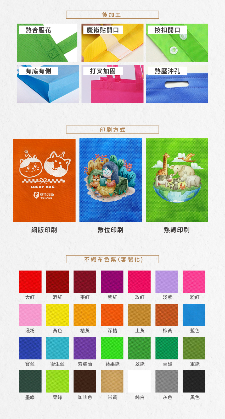 規 格:小 36x30x11 cm / 大 40x37x10 cm參考價:小NT$23(含單色印刷) / NT$25(含單色印刷)起訂量 :1000個材 質:不織布 + 魔鬼氈小的顏色:橘色 / 草綠 / 桃紅 / 水藍大的顏色:黑 / 水藍 / 米白 / 桃紅 / 草綠 / 寶藍LOGO呈現:印刷包 裝:OPP 袋螢幕顯示各有差異,實際顏色以實品為主商品圖片僅供參考,實際規格以出貨實品為主